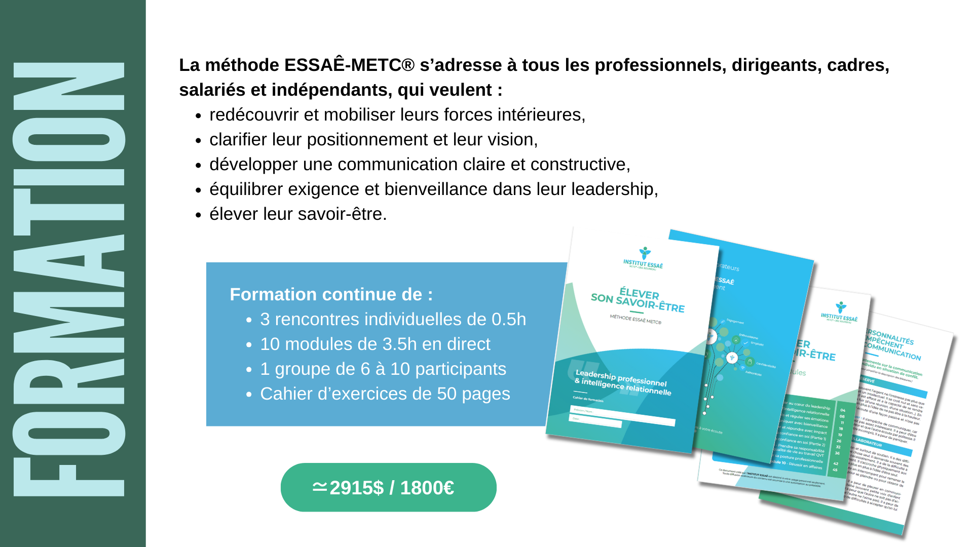 C’est exactement ce que propose la Méthode ESSAÊ-METC® : un parcours de formation continue conçu pour tous les professionnels, dirigeants, cadres, salariés et indépendants, qui veulent :